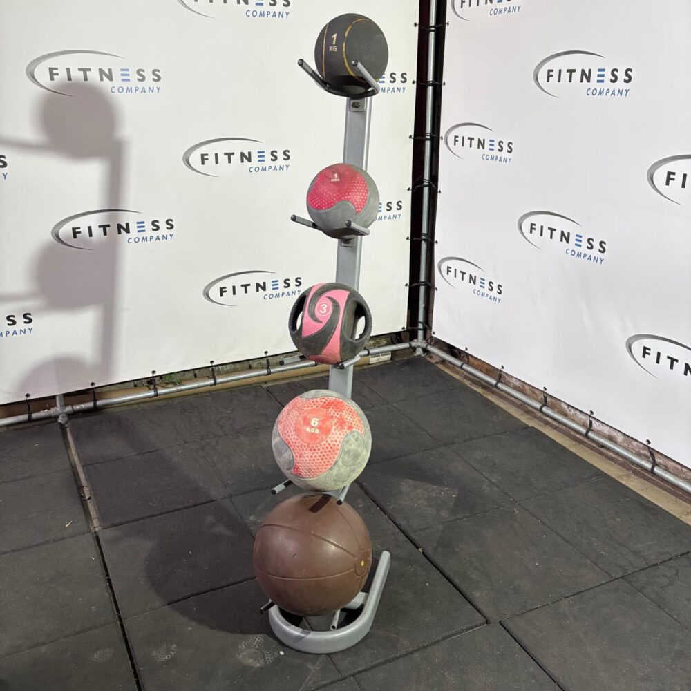 Dit rek met medicijnballen van verschillende gewichten biedt een complete en overzichtelijke oplossing voor functionele training.
